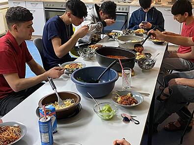 Die Versorgung der Jugendlichen kann gemeinschaftlich in unserer Mensa erfolgen. Aufgrund des Vorhandenseins einer Küche versorgen sich die jungen Menschen in der Regel selbst im Wohnbereich. Der Einkauf der benötigten Lebensmittel wird anfänglich begleitet, im weiteren Verlauf und unter dem Gesichtspunkt der Verselbstständigung übernehmen die Jugendlichen diese Aufgabe in Eigenverantwortung.